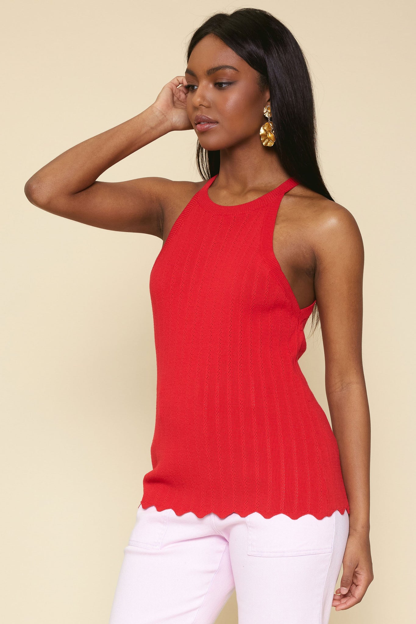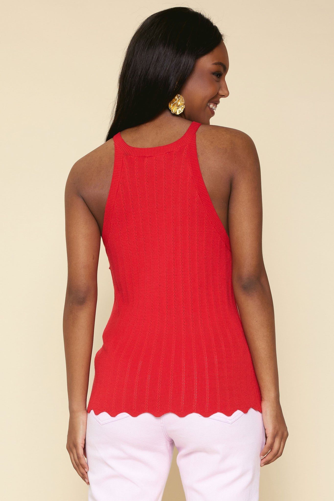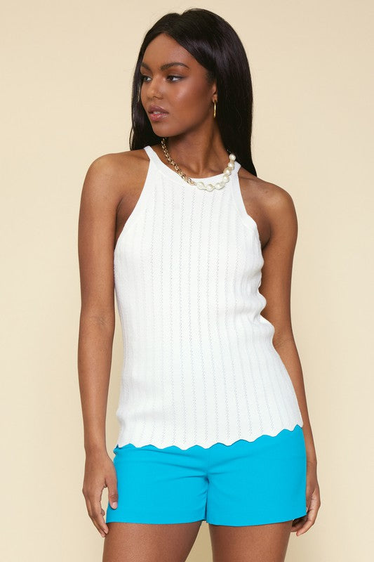Sleeveless Knit Halter Tank Top With Scalloped Hem