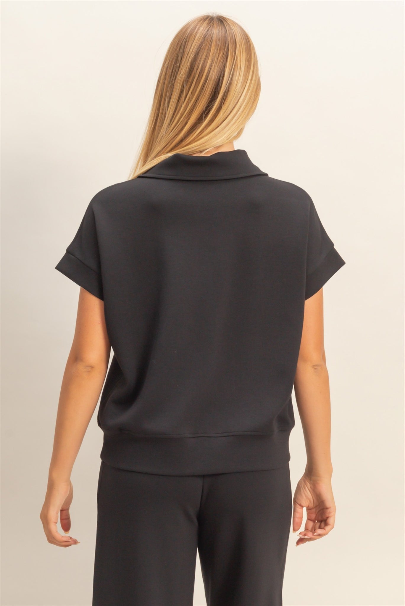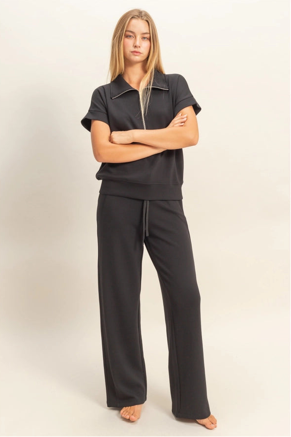 This short sleeve high neck top with a half-zip front offers a clean, modern silhouette. Designed in a relaxed fit, it combines casual comfort with a refined edge. Crafted from soft, breathable fabric, it's versatile enough for layering or as a statement piece for everyday wear.Experience Ultimate Comfort And Style With These Wide-Leg Drawstring Sweatpants. Designed With A Relaxed Fit, These Sweatpants Feature A Drawstring Waist For A Customizable Fit And Convenience. The Wide-Leg Cut Provides Ample Room For Movement, Making Them Perfect For Lounging Or Casual Outings. Crafted From A Soft, Cozy Fabric, These Sweatpants Ensure All-Day Comfort While Maintaining A Chic And Trendy Look Model Is 5' 8" Tall, 32" Chest, 25" Waist, 34" Hips And Wearing A Size Small Imported. Designed In The USA